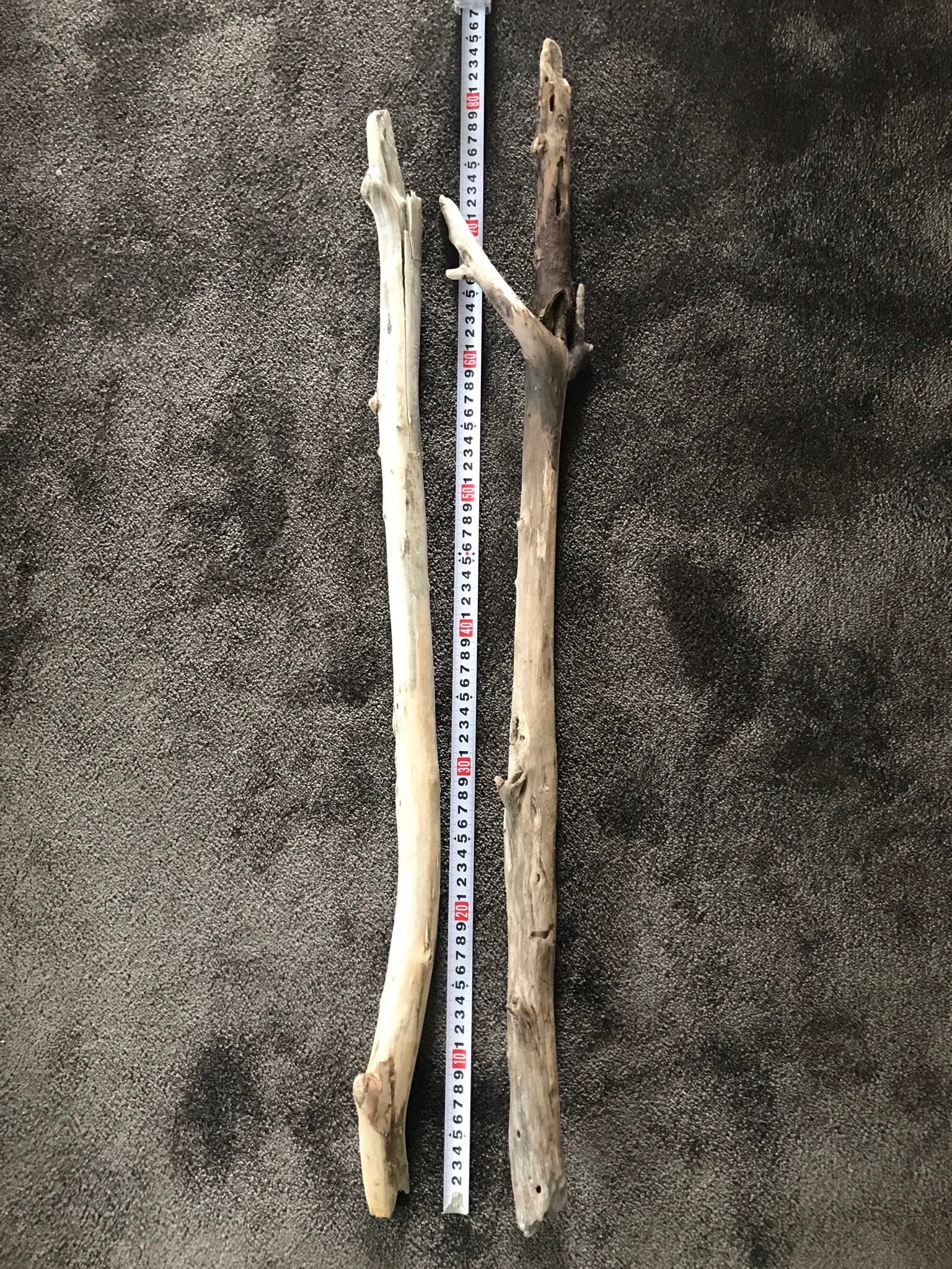 ロング流木2本セットです。画像左の流木は両先端が割れています。右の流木は木の皮が付いている状態です。